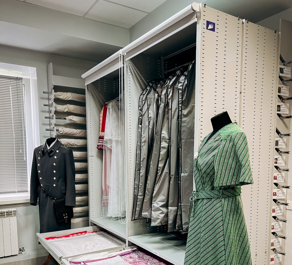Стеллажи с дверями позволяют надёжно защитить костюмы от пыли, света и внешних воздействий. Закрытые секции помогают поддерживать порядок и аккуратный внешний вид помещения, сохраняя ткани в отличном состоянии.