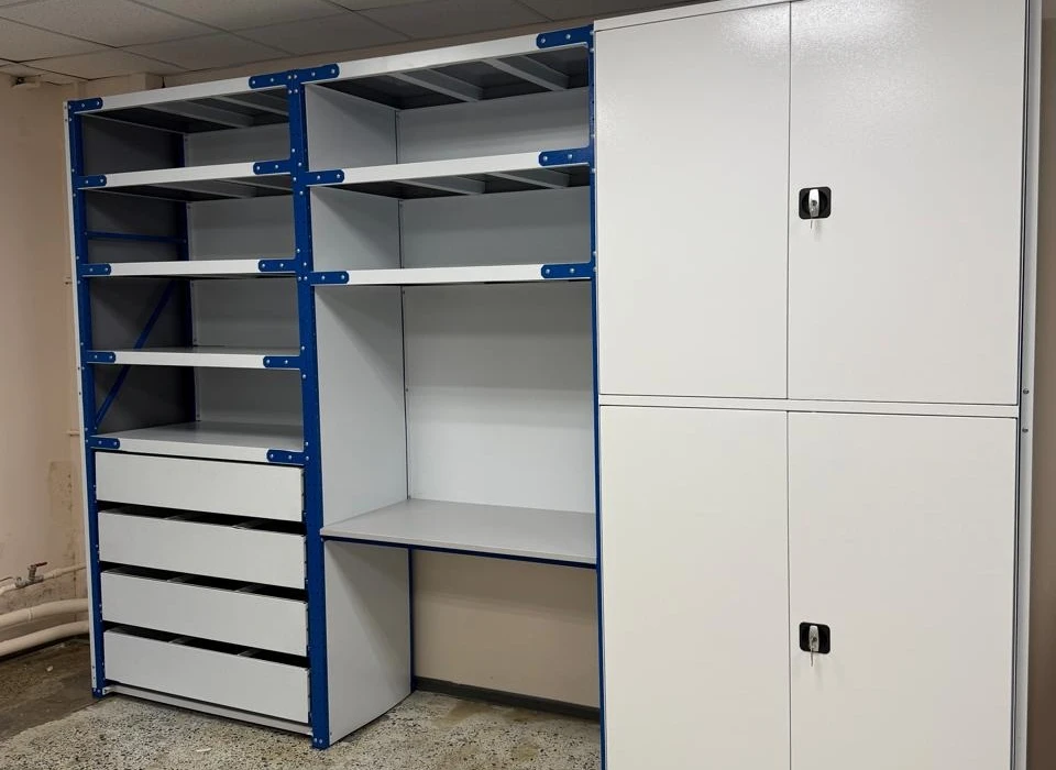 Стеллажный комплекс для склада с рабочим местом для инструментов или деталей, стеллажи дополнены верстаками, столами и дополнительными стойками и шкафами с дверями.
