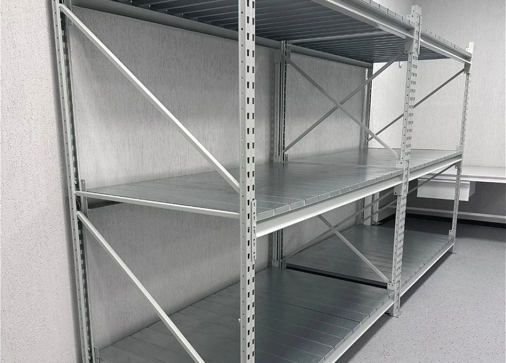 Среднегрузовой стеллажный комплекс по хранению грузов. В составе складского стеллажа дополнительно могут идти верстаки, столы, тумбы, дополнительные стойки.