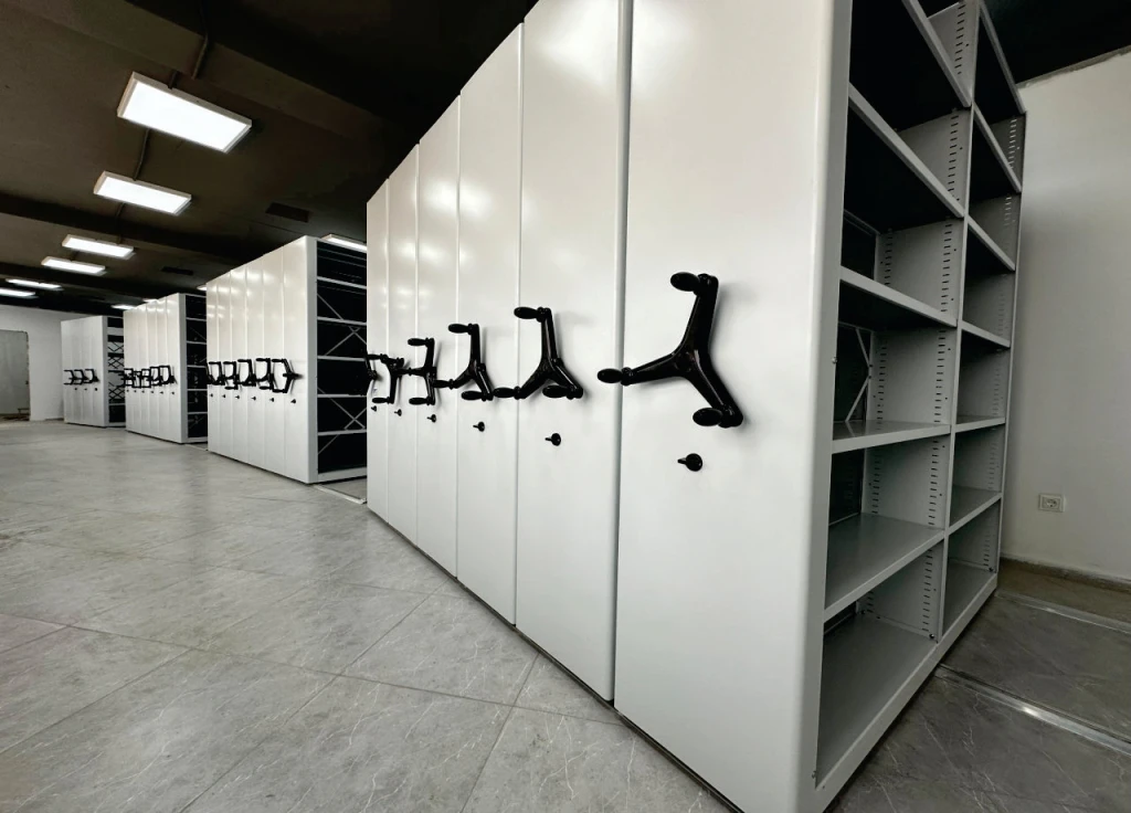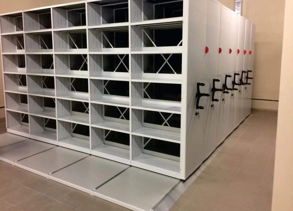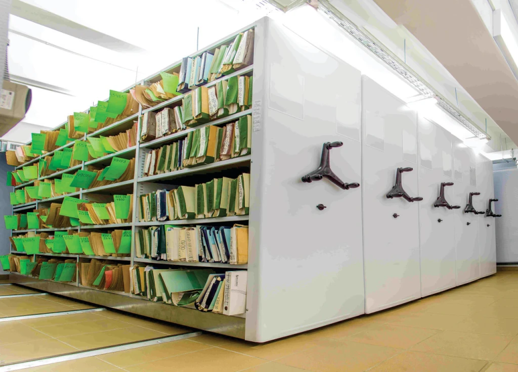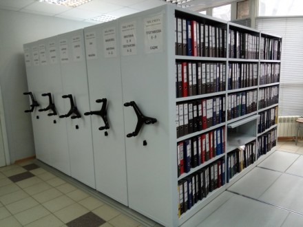 Мобильный архив с ручным или электронным управлением - системы компактного архивного хранения документов. Вдвое повышается вместимость под папки или сокращаются занимаемые площади. Используются двухсторонние передвижные стеллажи для архивохранилища.